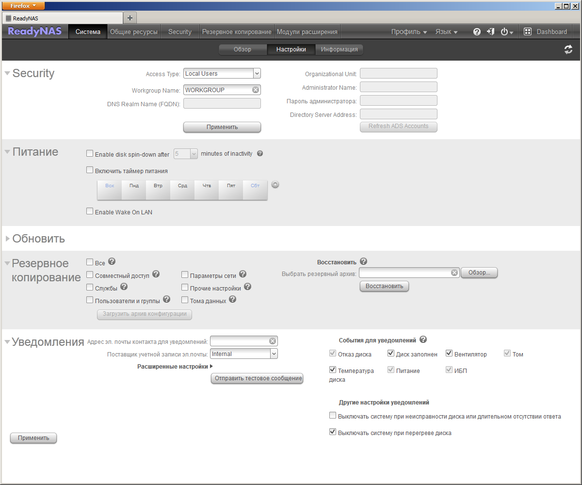 Продолжает запутывать пользователя и вторая страница этой группы, названная «Настройки». В ней пользователь может еще раз изменить имя рабочей группы, включить накопитель в домен для проверки имен и прав доступа. Управление питанием включает в себя отключение дисков в случае отсутствия активности, активацию WOL и установку расписания работы на неделю с точностью до часа. Сюда же определили обновление прошивки (можно это делать через интернет или с использованием локально загруженного файла), сохранение, восстановление и сброс настроек, настройку системы отправки уведомлений. Адрес получателя может быть только один, можно выбрать категории событий, отправка возможна через собственный сервер или внешние сервисы. В нашем случае первый вариант не сработал. Так что при настройке рекомендуем использовать возможность отправки тестового сообщения для проверки работоспособности функции.