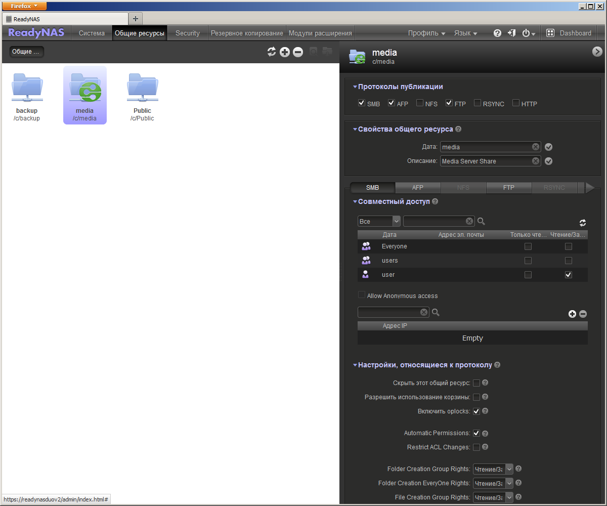 С «Общие ресурсы» все, к счастью, проще и понятнее. В левой части окна представлены сетевые папки, при выборе нужной из них справа отображаются ее параметры. Среди них — выбор протоколов доступа, установка прав доступа индивидуально для каждого протокола, включение индексации папки для сервиса ReadyDLNA и другие. Также не вызовет затруднений раздел «Secuity», где программируются пользователи и группы. Отметим: для каждого пользователя создается и личная папка. Поддержки дисковых квот в устройстве нет.
