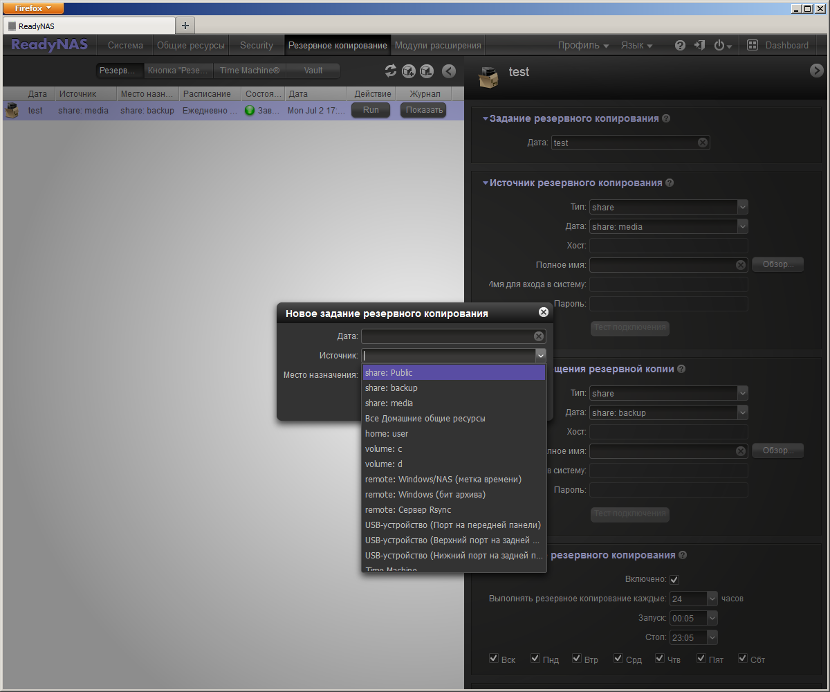 В основной прошивке реализованы несколько дополнительных функций. Одна из главных — встроенная автономная система резервного копирования. Пользователь может запрограммировать нужное число заданий, указав, что и куда копировать, расписание запуска и другие параметры. Источником и получателем могут служить общая папка, домашняя директория пользователя, том целиком, внешний USB-накопитель, подключенный в определенный порт или удаленный сетевой ресурс, доступный по SMB или RSync (один из параметров должен указывать на локальное устройство).