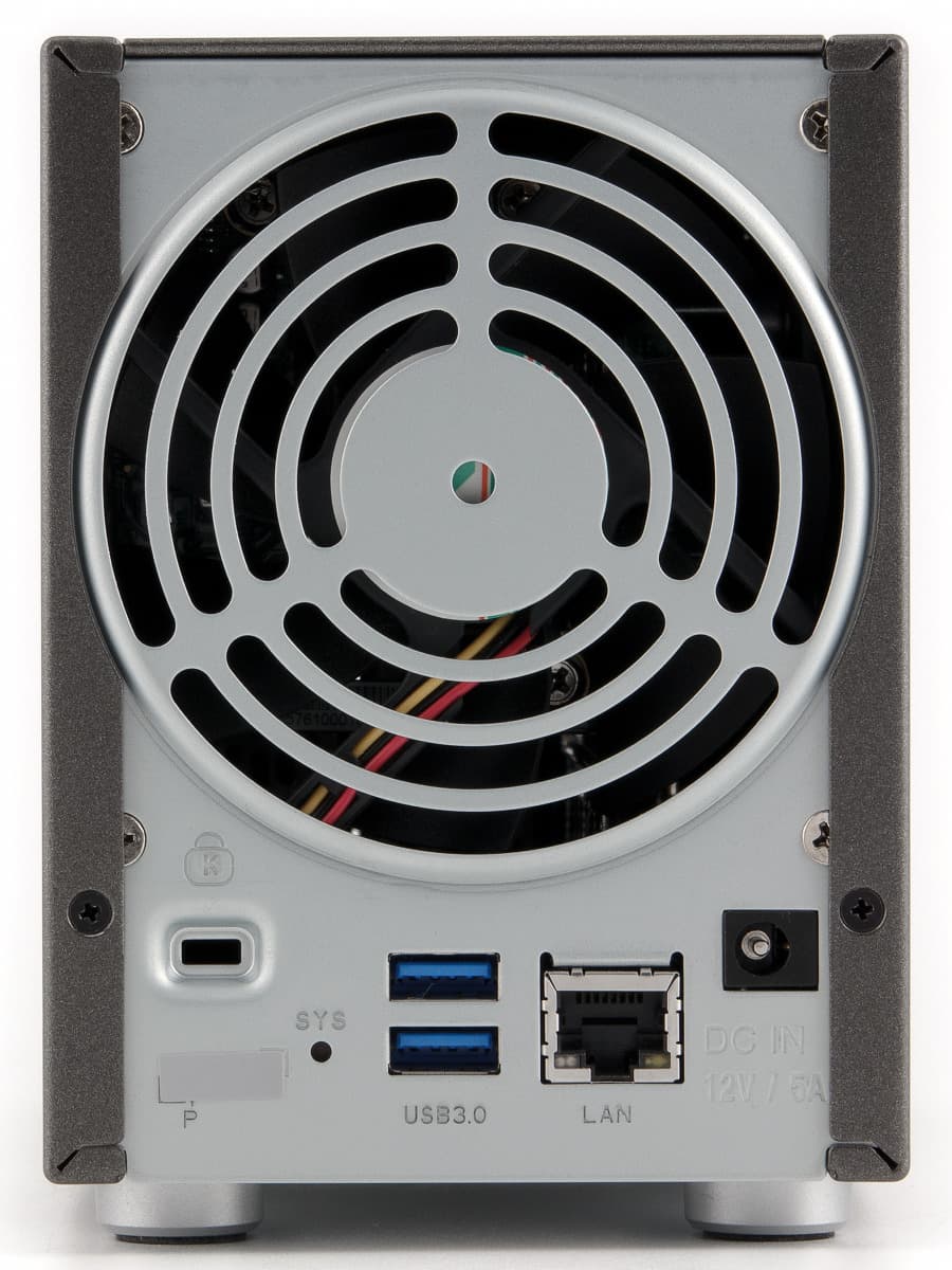 Также сзади остались кенсингтонский замок, кнопка сброса и гигабитный сетевой порт со встроенными индикаторами. Опирается модель на четыре крепкие резиновые ножки, что гарантирует устойчивость. Нужно отметить, что это одно из наиболее компактных двухдисковых устройств на рынке. С точки зрения дизайна устройство успешно продолжает заданное предшественником направление.