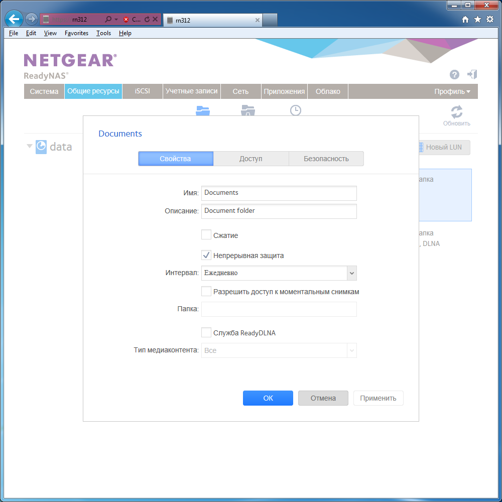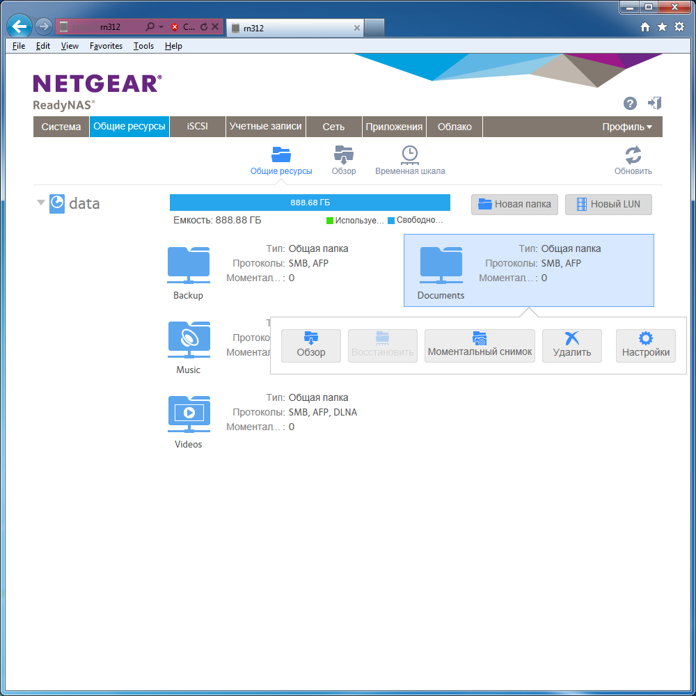 На дисковых томах как обычно требуется создать нужное число общих папок. Для каждой из них можно выбрать требуемые протоколы, указать права доступа, включить сжатие. Очень интересно выглядит возможность работы со снимками (snapshot). Система способна самостоятельно создавать резервные копии данных из папок с указанной периодичностью (час, день, неделя). Администратор может разрешить доступ к ним и обычным пользователям, так что вернуться к прошлой копии важного документа будет очень просто. Ограничений на число снимков и контроля за ними в системе не предусмотрено. Наиболее старые автоматически удаляются при необходимости.