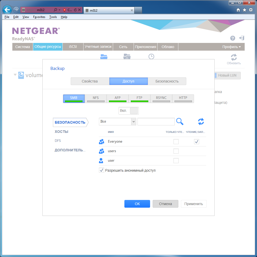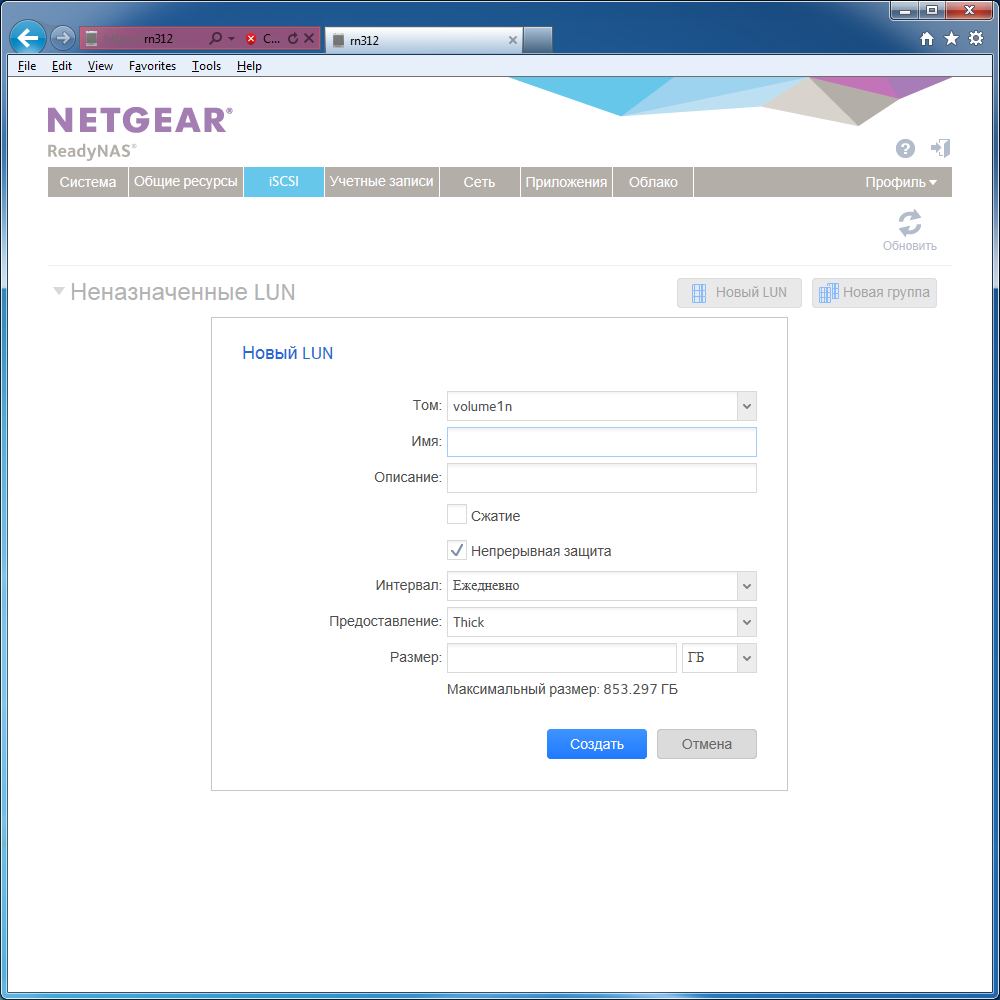 Накопитель поддерживает работу по протоколу iSCSI. LUN создаются на уже существующих томах. Интересно, что для них также поддерживается защита по технологии снимков. LUN организуются в группы с общим именем цели. Для них можно задать права доступа со стороны клиентов.