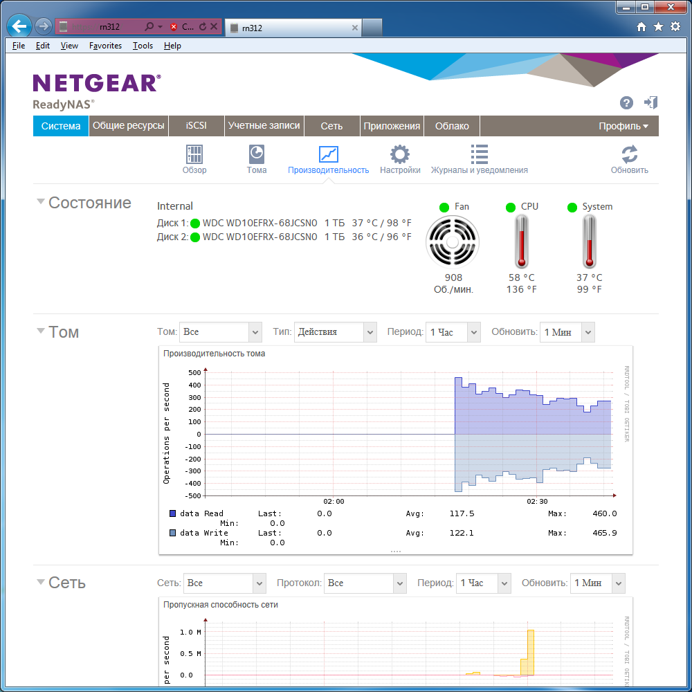 Очень интересно выглядит страница «Производительность». Кроме отображения состояния дисков (S.M.A.R.T. и температура), скорости работы вентилятора, температур процессора и системы, здесь есть знакомые многим энтузиастам Linux графики RRDtool по множеству системных параметров. В частности можно узнать нагрузку на дисковые тома и сеть (отдельно по каждому протоколу), % использования дискового пространства, температуры процессора и системы. Причем журналы сохраняются на срок до года. Жаль, что нет информации по загрузке процессора и оперативной памяти.
