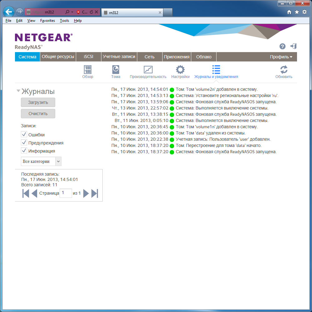 Накопитель ведет достаточно подробный системный журнал. Однако возможности записи действий сетевых пользователей в данной модели нет (кроме лога FTP). Для информирования администратора используется электронная почта. Можно указать только один адрес получателя и выбрать типы событий для отправки уведомлений. Обязательно использование внешнего сервера SMTP для передачи сообщения. Для удаленного контроля работы сервера есть поддержка SNMP, включая фирменный файл описания MIB.