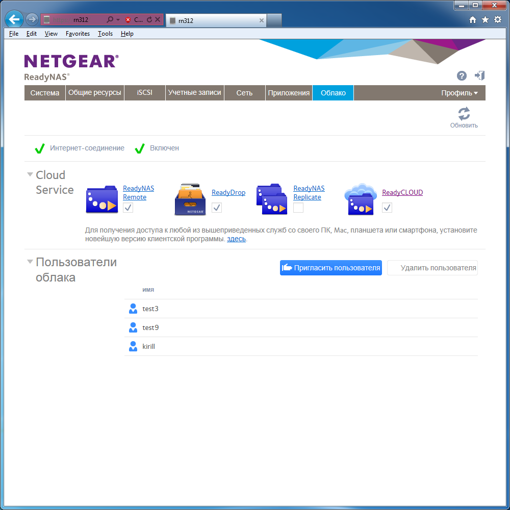 Видимо желая еще больше запутать пользователей, в новой версии прошивки компания предложила сервис ReadyCloud. Он реализует доступ к данным и интерфейсу администрирования зарегистрированных на данную учетную запись устройств (база общая с ReadyNAS Remote). Хотя и в ней не решен вопрос с контролем доступа к файлам. Если к папке не разрешен доступ всем, то и через ReadyCloud вы документов не увидите.