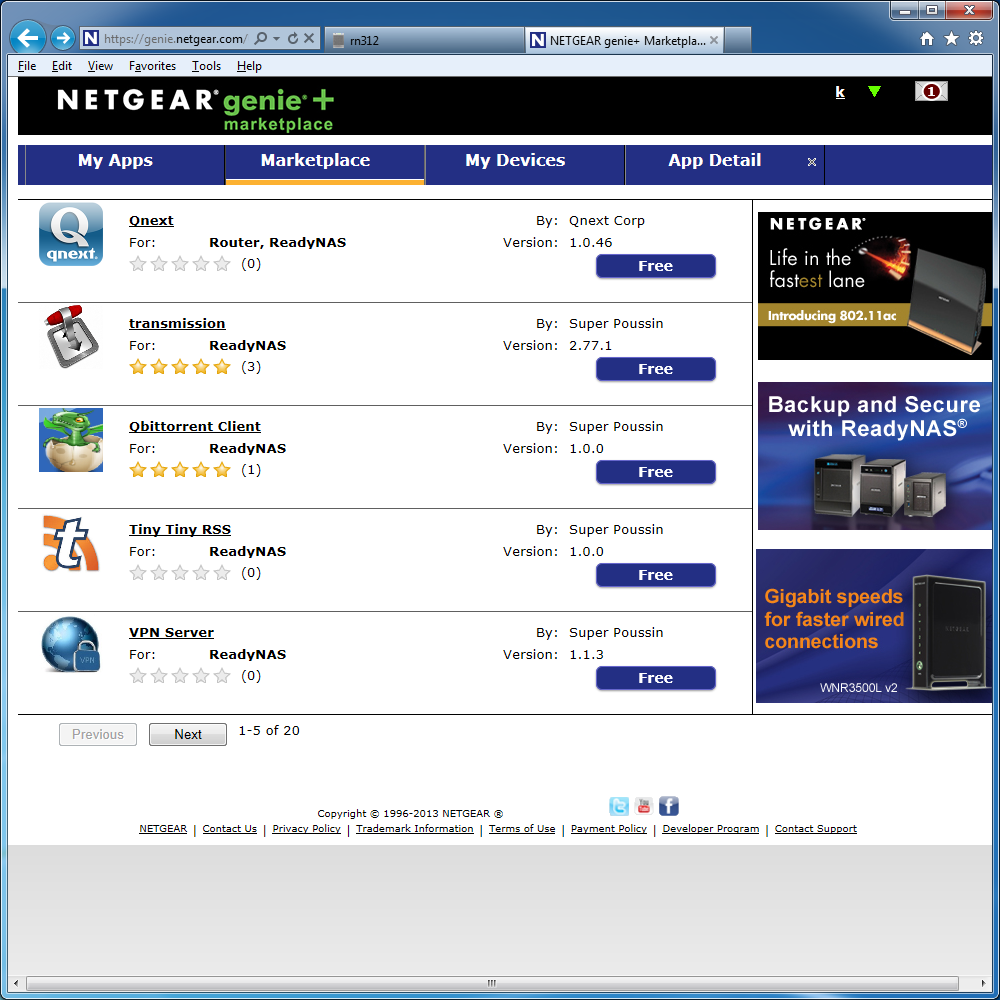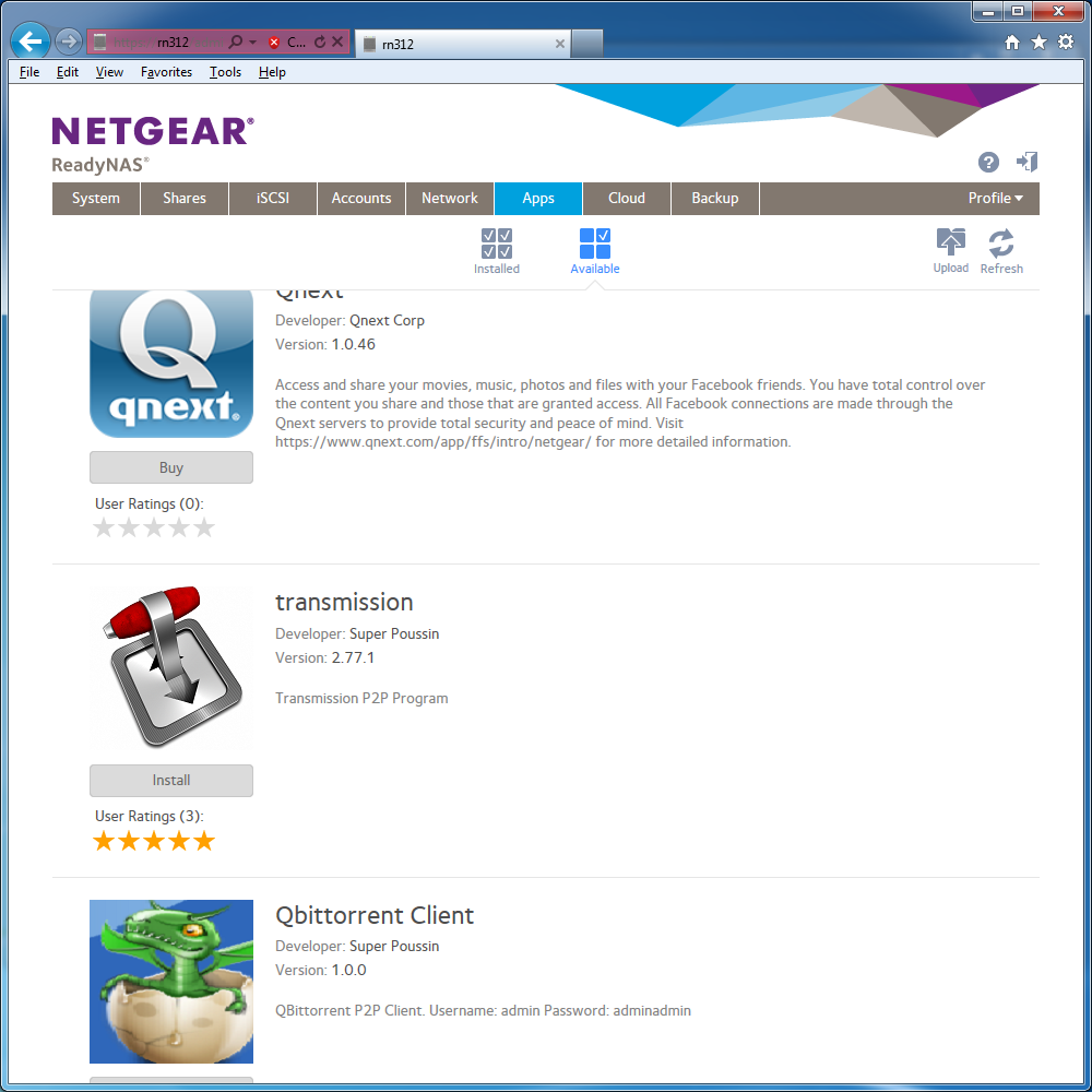 Установить приложение из каталога возможно как через сам накопитель, так и через сайт магазина. Из наиболее интересных программ отметим transmission, VPN Server, Plex Media Server, Wordpress, Drupal, joomla, MySQL. Отметим, что возможность установки программ из загруженных из интернета готовых пакетов сохранилась, однако видимо изменился формат пакетов. В документации также упоминается платный сервис видеонаблюдения (ReadyNAS Surveillance). К сожалению, он не представлен в каталоге магазина, так что испытать его не получилось.