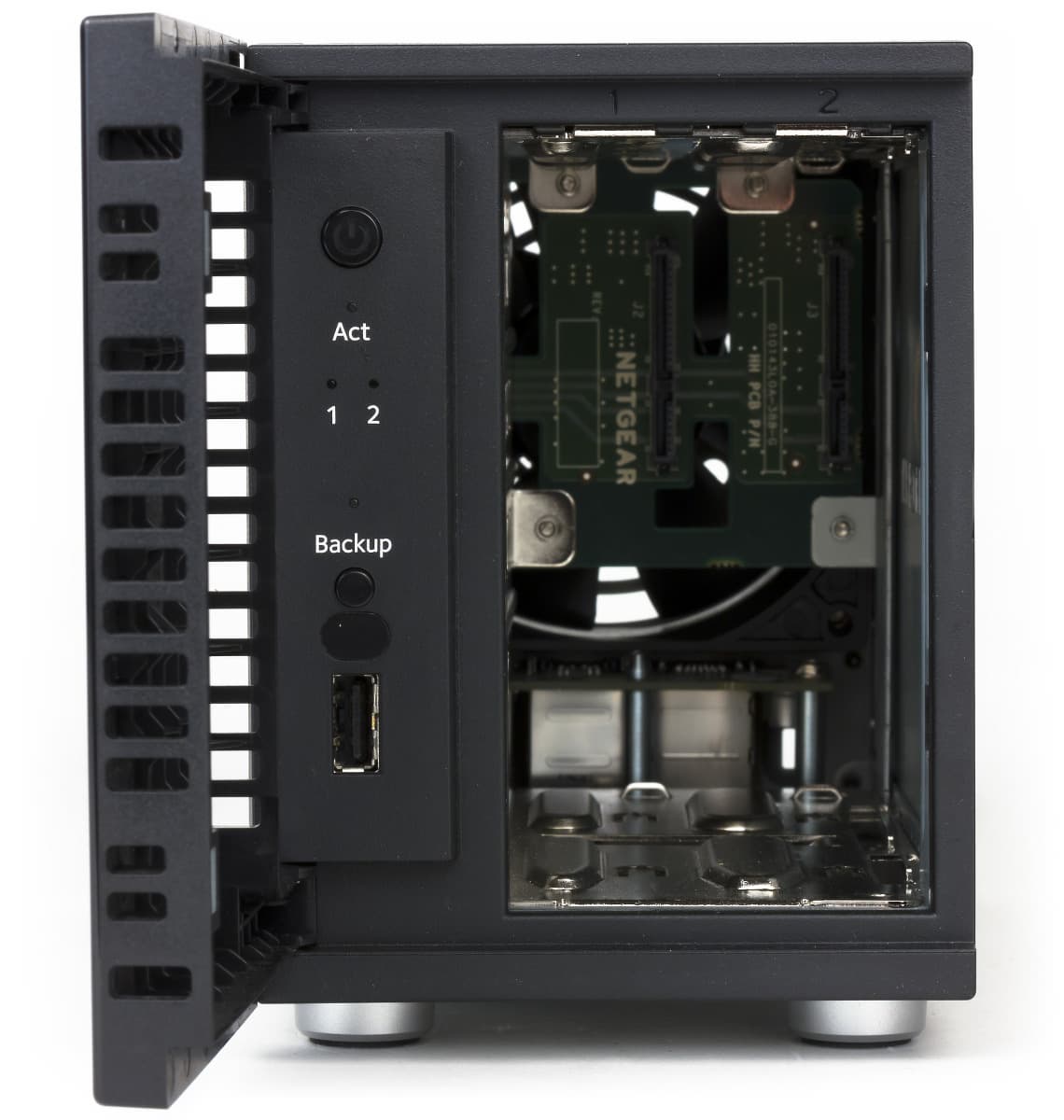При этом для забора воздуха используются решетки с торцов крышки, которой заметно увеличили толщину. В результате в левой части получилось углубление, в котором находятся кнопка включения питания с индикатором, светодиоды активности и статуса дисков, блок из индикатора, кнопки и разъема USB 2.0 для реализации оперативного копирования данных с/на внешние носители, а также окошко ИК-приемника. На крышку установлены магнитные крепления, так что открывается она легко и не болтается.