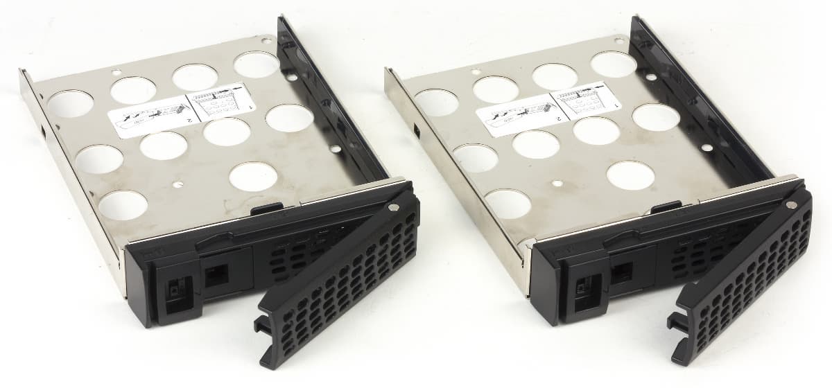 Для установки 3,5″ винчестеров не потребуются инструменты — специальная конструкция рамок позволяет закрепить диски без винтов. Но при необходимости пользователь может их и установить, правда они не входят в комплект. В случае работы с 2,5″ винчестерами они закрепляются стандартным способом через отверстия на дне. Основание рамок металлическое, механизм крепления дисков и передняя панель изготовлены из пластика. Предусмотрены дополнительные защелки для их надежного крепления в корпусе накопителя.