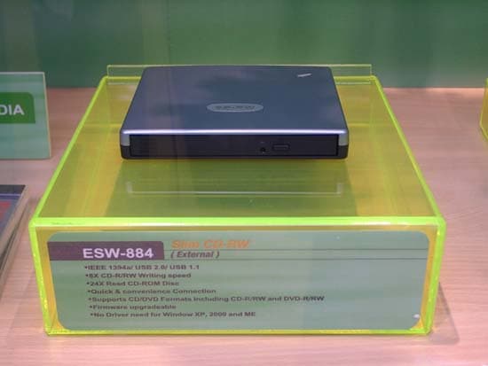 Также был продемонстрирован внешний USB 2.0 вариант 40х рекордера, модель EHW-4048 и Slim CD-RW дисковод ESW-884, поддерживающий передачу данных по шине USB 1.1, USB 2.0 и IEEE 1394. Максимальная скорость записи и перезаписи, поддерживаемая ESW-884 — 8x, скорость чтения — 24x. Рекордер не требует установки драйвера при подключении к компьютеру, работающему под управлением Windows 2000, ME и XP.