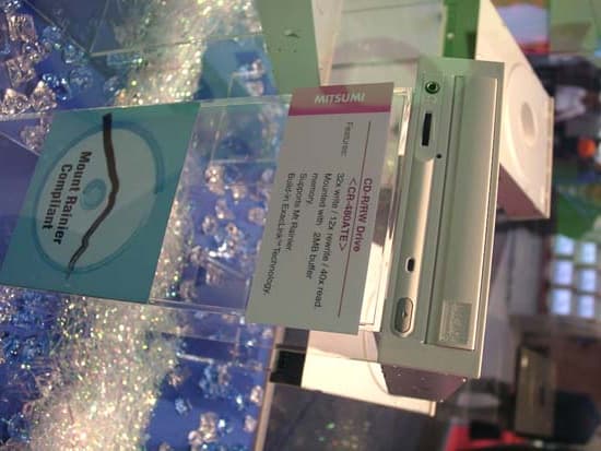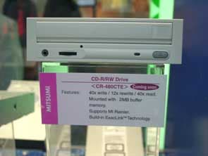 Компания Mitsumi на CeBIT демонстрировала, помимо своего флагмана — весьма неплохо продающийся сегодня CR-480ATE (32/12/40, 2 Мб буфера, поддержка ExacLink и Mt. Rainier), новейший CD-RW дисковод CR-480CTE, который обладает возможностью сорокаскоростной записи и двенадцатикратной перезаписи. CR-480CTE несет «на борту» 16 Мб буферной памяти, а скорость произвольного доступа к данным составляет 84 мс. Новый дисковод Mitsumi также поддерживает технологию защиты от опустошения буфера Exaclink и формат Mt. Rainier.
