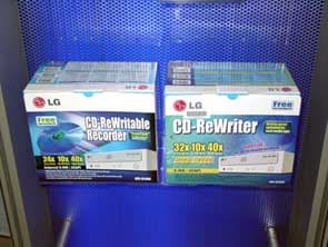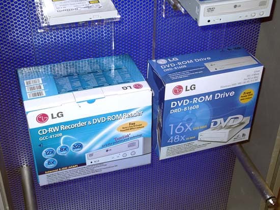 Помимо GMA-4020B компания LG продемонстрировала линейку CD-RW дисководов, начиная от 24/10/40 модели GCE-8240B, заканчивая флагманской 40/12/40 моделью GCE-8400B. Пожалуй, самыми интересными являются две старшие модели — уже упомянутая GCE-8240B, а также 32/10/40 рекордер LG GCE-8320B. Оба рекордера отличаются друг от друга лишь максимальными скоростями записи. В остальном же их характеристики идентичны: средняя скорость доступа к данным 110 мс, поддержка формата Mt. Rainier, 8 Мб буфер и технология защиты от опустошения буфера SuperLink