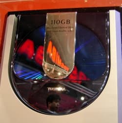 Toshiba, похоже, решила всех удивить в очередной раз, представив на CeBIT 2002 в Ганновере еще одну новинку: двухсторонний DVD емкостью 110 Гб. Toshiba утверждает, что смогла добиться такой большой емкости благодаря применению, во-первых, коротковолнового (синего) лазера, во-вторых, используя двойной записываемый слой. Как и в 30 Гб оптическом диске, в новом DVD используется схема записи с внешней и внутренней стороны дорожки. Однако, длина записи одного бита несколько больше, чем у 30 Гб диска, чтобы облегчить считывание сигнала с нижележащего слоя. Так что вместо 60 Гб на одной стороне, получилось 55 Гб на каждой из сторон и 110 Гб в сумме.