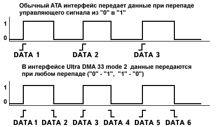 - Большая, чем у ATA скорость передачи данных. Ultra DMA-33 имеет три режима 0, 1 и 2. При использовании самого быстрого Ultra DMA 33 Mode 2 скорость передачи данных может достигать 33 Мбайт в секунду. Такая высокая скорость передачи данных достигается использованием для пересылки восходящего и спадающего уровня сигнала.