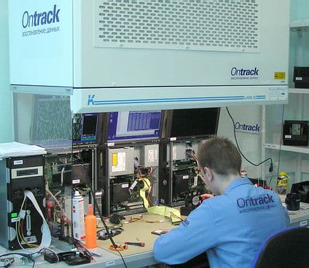 Восстановление данных в лаборатории после начальной диагностики будут успешными при наличии профессиональных знаний людей и профессионального оборудования. Ведь каждый случай потери данных вследствие повреждения носителя требует вмешательства в его внутреннюю структуру. Носители производятся в стерильных условиях, и чтобы гарантировать полную безопасность данных необходимо обеспечить условия соответствующей чистоты воздуха в помещении, где производятся работы. Норма воздуха, который окружает работающий жесткий диск в лаборатории Ontrack Data Recovery, — это класс чистоты 100. Устройство, которое создает такие стерильные условия при работе с открытым жестким диском, называется «чистая комната» (clean room). Эффективность и высокие нормы по обеспечению необходимой чистоты воздуха, выполняемые в лабораториях Ontrack, подтверждают производители носителей, продлевая гарантию на свой продукт и после вскрытия жесткого диска в лаборатории Ontrack Data Recovery. Благодаря использованию этого специального оборудования увеличивается не только вероятность восстановления данных, но также улучшается работоспособность жесткого диска. Работа над открытым диском в несоответствующих условиях сокращает его работоспособность со 100 тыс. до 10 тыс. раз, в зависимости от модели и марки носителя.