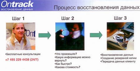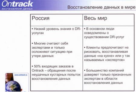 Интересно, что в российское представительство Ontrack часто обращаются с просьбой восстановить данные, которые не удалось восстановить в других отечественных лабораториях. Сотрудники Ontrack настоятельно рекомендуют обращаться сразу в Ontrack, чтобы получить наиболее квалифицированную помощь и наивысшую вероятность восстановления данных. Например, недавно клиент обратился с ноутбучным диском, у которого «специалисты» другой «лаборатории» при сборке перепутали местами пластины, поставив их «вверх ногами». И такие случаи в нашей действительности отнюдь не единичны. В Ontrack частенько обращаются и после неудачных попыток «специалистов» программно восстановить данные, в результате чего произошла дополнительная порча данных.