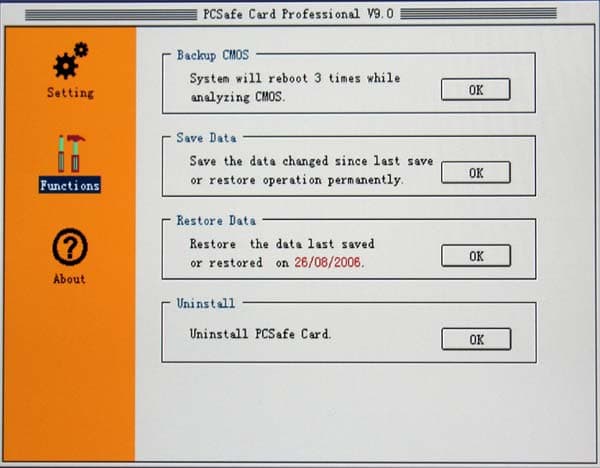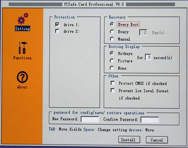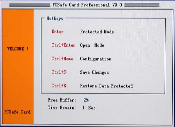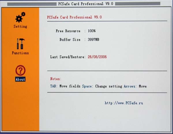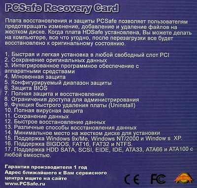 Основным предназначением PCSafe Recovery Card является отслеживание изменений, происходящих на винчестере вверенного ей компьютера и, при наличии на то желания пользователя, их оперативная отмена, то есть полный возврат данных на винчестере в исходное состояние за несколько секунд. Это свойство, несомненно, оценят измученные нездоровой активностью пользователей администраторы корпоративных сетей, игровых залов, интернет-кафе и прочих мест, где набор установленного на компьютерах ПО более-менее постоянен, а пользовательские данные локально не хранятся. Поскольку управление карта PCSafe Recovery Card получает до загрузки операционной системы, то вирусы и их последствия, случайно удалённые системные папки, отформатированные винчестеры (в том числе и на низком уровне), самовольно установленные и дестабилизирующие работу ОС шушерные утилитки и прочие ночные кошмары сисадмина сгинут в небытие со следующей перезагрузкой — как вурдалаки с первым криком петуха. А против особо вредоносных пользователей карточка может быть использована и как тайное оружие, проливая бальзам на измученное сисадминское сердце видом шалеющего юзера, в десятый раз установившегося любимую софтину и в десятый раз не обнаружившего ни малейших её следов после затребованной программой перезагрузки. :)