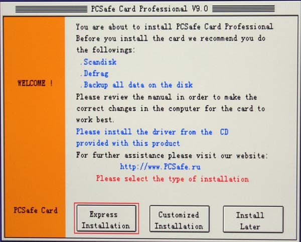 Здесь мы можем либо произвести экспресс-инсталляцию с приемлемыми (по умолчанию) параметрами (а именно: защита только первого раздела при каждой перезагрузке, без запрещения прямого доступа к диску и защиты CMOS), либо произвести все необходимые настройки самому. Либо, «впечатлившись» советами о том, что следовало бы сделать до установки карты, отложить это действие.