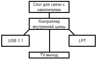 Вот и схема дока. Тоже все элементарно: получив команду от основного контроллера и сопутствующие данные, встроенный в него контроллер отдает информацию либо на USB, либо на TV-выход, либо принтеру. Возможно, в доке даже контроллера как такового нет — три этих компонента просто выходят на внутреннюю шину.