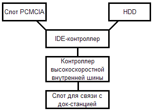 Начнем с Digital Album. Здесь все просто: главным управляющим элементом является высокоскоростной контроллер, который обеспечивает обмен данными между компонентами. Скорость обмена данными между винчестером и картой памяти лимитируется разве что контроллером IDE, т. е. на практике почти неограниченна. Есть и еще один компонент, не показанный на схеме (не знаю точно, отдельный ли он, и если да, то в какой части находится), отвечающий за декодирование JPEG и других форматов в целях визуализации файлов. Однако без дока устройство достаточно примитивно: данные могут уйти лишь на слот для его подключения.