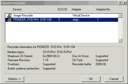 Итак, главное блюдо сегодняшнего обеда. Работа привода с DVD-R дисками. Вы спросите, почему главное? На данный момент это наиболее совместимый с бытовыми DVD плеерами формат, и DVD-R — это наиболее дешевые диски на рынке аналогичных носителей, стоимость Noname DVD-R дисков опустилась до $1-2. Правда, бесплатных пирожных не бывает, такие Noname болванки смогут работать только в режиме записи 1Х. Напомню вам, что для DVD скорость 1х-равна 1385Kb/s. Фирменные же болванки, способные работать в режиме записи 2Х, стоят значительно дороже — $5-7. Увы, в приводе Pioneer DVR-104, как и в DVD-A03, запись на скорости 2х всецело зависит от используемых дисков. Привод может автоматом сбрасывать скорость записи до 1х, если ему не понравился диск.