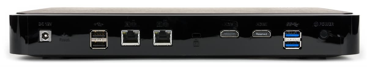 На задней панели находятся вход блока питания с выключателем (программным), два гигабитных сетевых порта с индикаторами, два порта USB 2.0, два порта USB 3.0, скрытая кнопка сброса, выход HDMI, отверстие кенсингтонского замка. Заметим, что на нашем экземпляре был и второй разъем HDMI, закрытый заглушкой с надписью «зарезервировано».