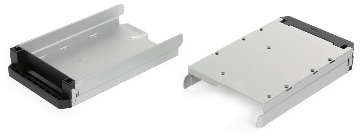 Накопитель поставляется без жестких дисков. Для их установки необходимо снять переднюю панель, вытащить специальные рамки, закрепить на них винчестеры и собрать все в обратной последовательности. Заметим, что для крепления используются комплектные винты, терять которые нежелательно, поскольку они имеют достаточно редкие характеристики. Допускается работа как со стандартными 3,5″ дисками, так и с 2,5″ винчестерами и SSD.