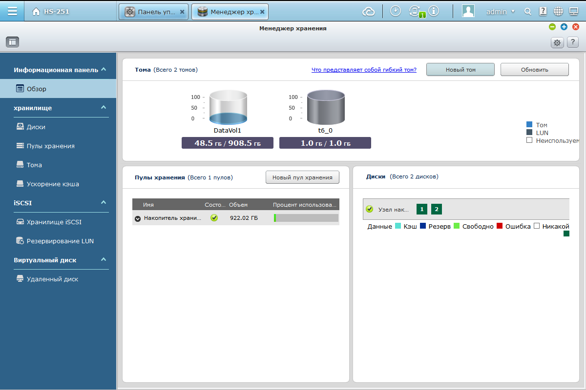 Основной обязательной операцией при настройке модели является выбор конфигурации дисковых томов. В рассматриваемой модели сетевого накопителя с двумя отсеками для дисков можно работать с двумя независимыми томами или организовать винчестеры в массив JBOD, RAID0 или RAID1. Как и у других устройств QNAP, присутствуют функции замены дисков в зеркальном массиве, миграции, проверка состояния файловой системы и другие. Устройство поддерживает работу с пулами дисков и томами iSCSI (файловыми и блочными), что позволяет гибко управлять конфигурацией системы хранения данных.