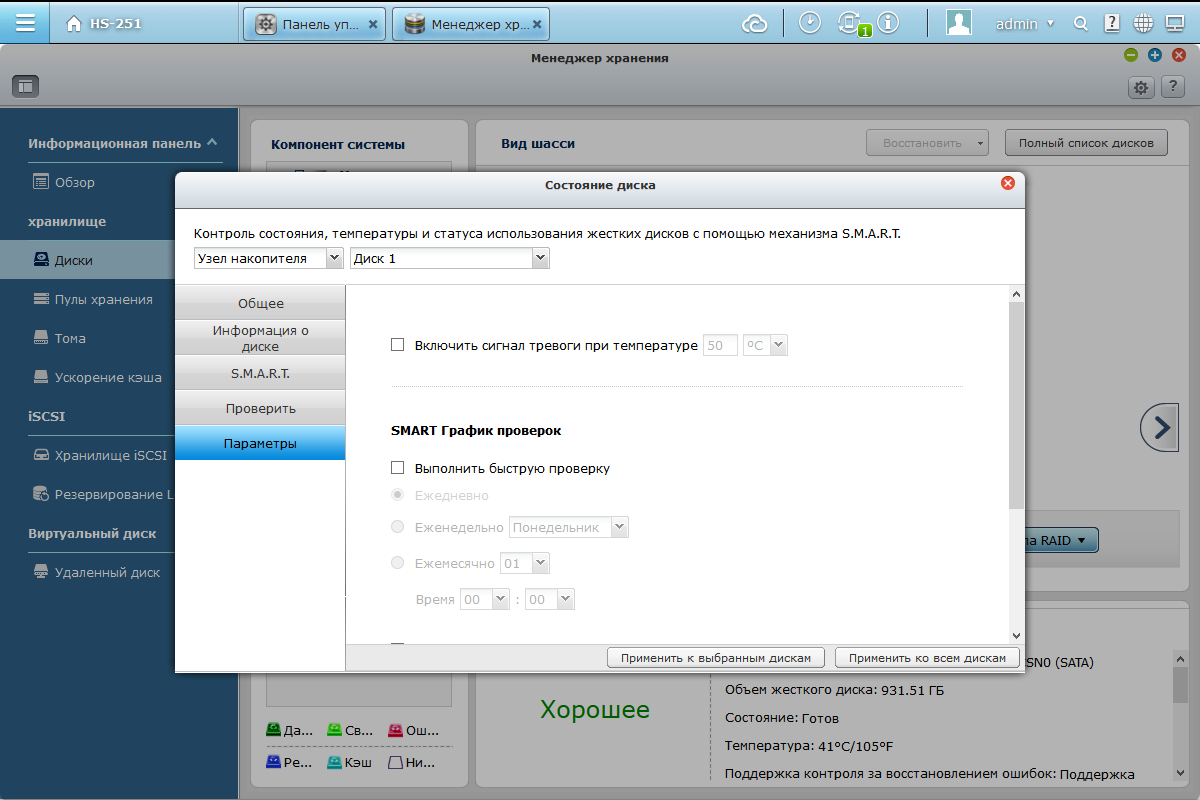 Контролировать состояние винчестеров можно с применением технологии SMART, составив расписание регулярных проверок. Предусмотрено использование SSD в качестве кэширующего накопителя.