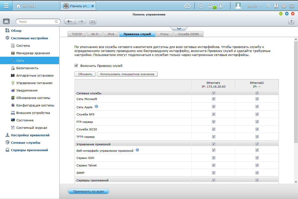 Для подключения к локальной сети предусмотрено два гигабитных сетевых адаптера. Они поддерживают работу в режимах объединения и отказоустойчивости, привязку сервисов к интерфейсам, протокол IPv6, технологию WOL, Jumbo Frames. Есть встроенные клиенты DDNS, PPTP и OpenVPN. Есть возможность подключения беспроводного адаптера в порт USB и работа по Wi-Fi. Хотя конечно скорость в этом случае будет существенно отличаться от проводного гигабитного соединения.