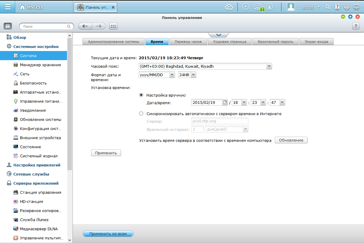 В системных опциях предусмотрено обновление прошивки (в том числе и с загрузкой файла с сервера производителя), работа с конфигурацией, настройка времени и синхронизация часов через интернет, установка расписания работы, включение спящего режима винчестеров, отключение звуковых сигналов.