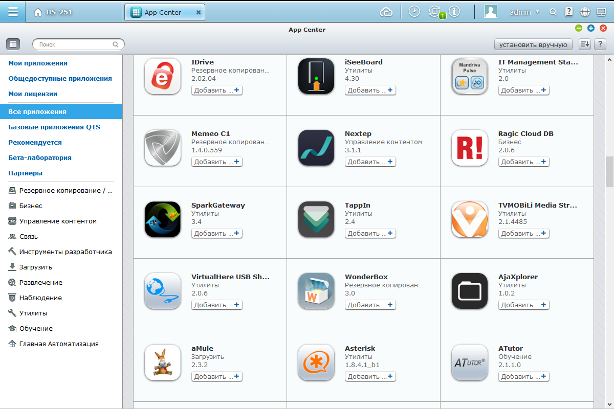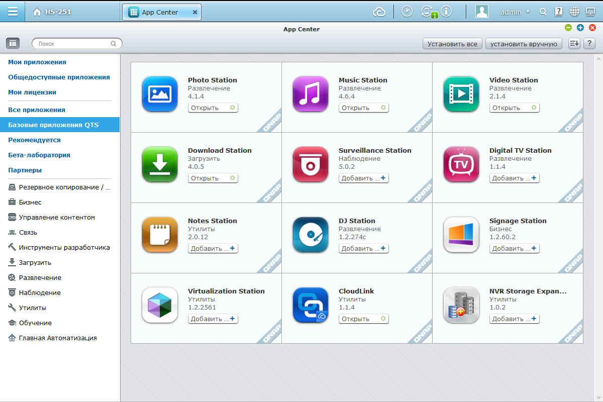 Управление дополнительно устанавливаемыми модулями и лицензиями осуществляется через App Center. Кроме официального каталога программ можно устанавливать модули и из файлов, загруженных из интернета. Предусмотрена группировка по категориям, выбор варианта сортировки, обновление программ и другие функции. Ознакомиться с текущим списком можно на специальной странице сайта производителя. На момент подготовки обзора для тестируемой модели существовало 145 дополнительных программных модулей. Из наиболее интересных, прежде всего, стоит отметить фирменные сервисы CloudLink, Download Station, Music Station, Photo Station, Surveillance Station, Video Station, Virtualization Station. Часть этих программ может использовать собственные страницы управления, доступные по прямым ссылкам, без необходимости сначала заходить в основной веб-интерфейс.