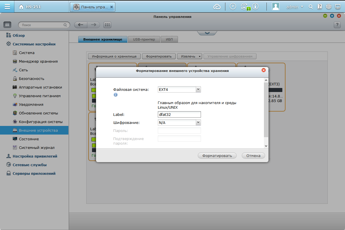 Установленные на задней панели порты USB предназначены для использования с внешними накопителями, ИБП, принтерами, беспроводными адаптерами, звуковыми картами, камерами и другими периферийными устройствами. В первом сценарии можно работать со всеми популярными файловыми системами, включая NTFS, EXT4 и HFS+. В веб-интерфейсе предусмотрены функции получения информации о внешних дисках и их форматирования.