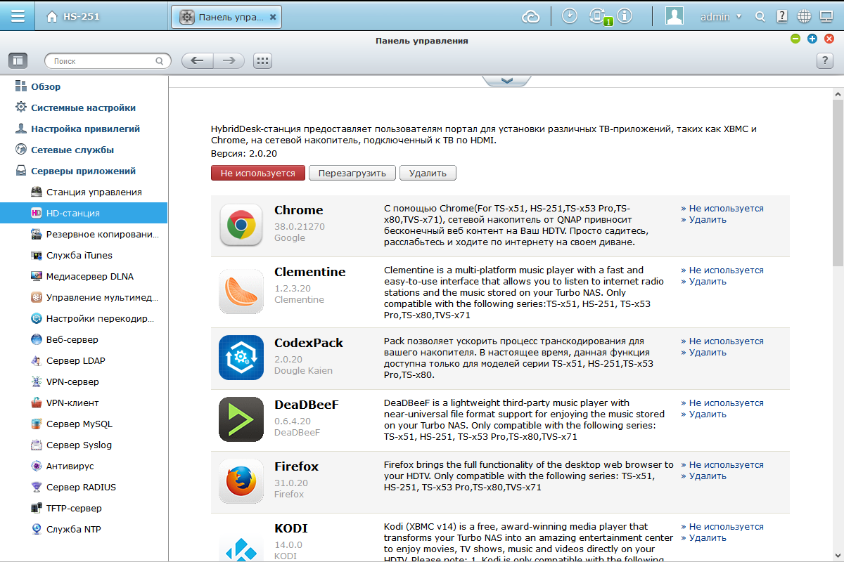 Все связанные с видеовыходом функции собраны в HybridDesk Station. В текущей версии прошивки в ней появились новые модули и теперь пользователю предлагается почти полтора десятка специальных приложений: браузеры Google Chrome и Mozilla Firefox, музыкальные плееры Clementine, DeaDBeef и Spotify, медиаоболочки XBMC и KODI, клиент станции видеонаблюдения, доступ к интерфейсу настройки накопителя, игры OpenTTD, Supertux и Wesnoth, каталог онлайн радиостанций TuneInRadio, клиент YouTube.