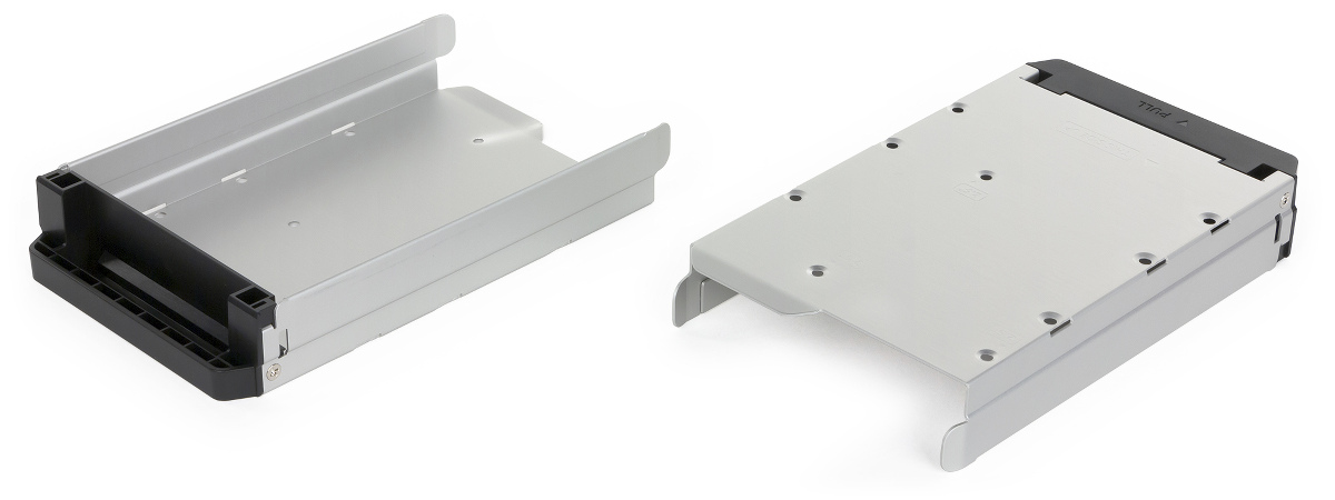 Панель закрепляется с использованием магнитов и может быть легко снята. За ней находятся два отсека для установки жестких дисков на специальных рамках. Последние имеют пластиковые защелки без специальных замков. В данном случае это вполне разумное решение.