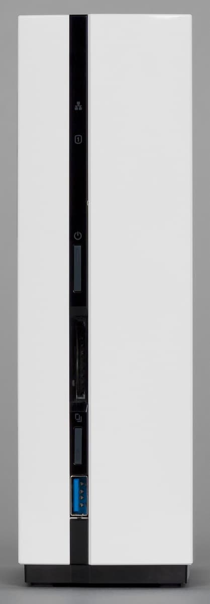 На темной вставке передней панели находятся индикаторы (статус Android на верхнем торце, сеть, диск), кнопка включения питания со встроенным светодиодом, слот для карт памяти SD (максимальный поддерживаемый объем производитель не уточняет), кнопка запуска операции копирования и порт USB 3.0 с индикатором.