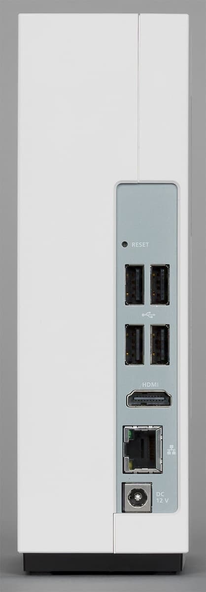 Сзади мы видим панель с четырьмя портами USB 2.0, выходом HDMI, гигабитным сетевым портом и входом блока питания. Также на ней находится отверстие скрытой кнопки сброса. Отметим, что минимально необходимые разъемы (сеть и питание) расположены в нижней части корпуса, что правильно с точки зрения удобства и надежности установки.