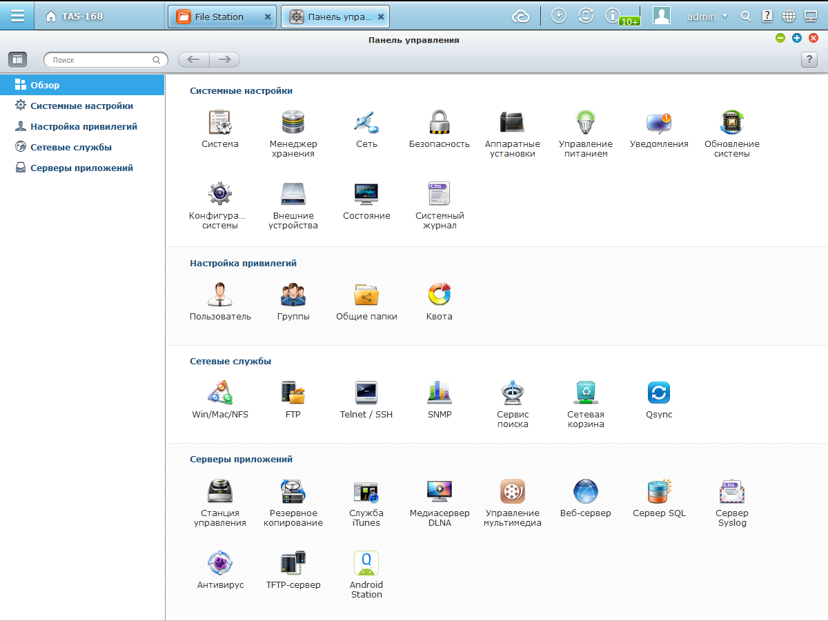 Встроенное программное обеспечение TAS-168 — QTS версии 4.1 (модели других серий уже получили обновление до 4.2). Мы много раз встречались с ним в наших тестированиях и можем с уверенностью сказать, что это один из наиболее удобных и функциональных вариантов.