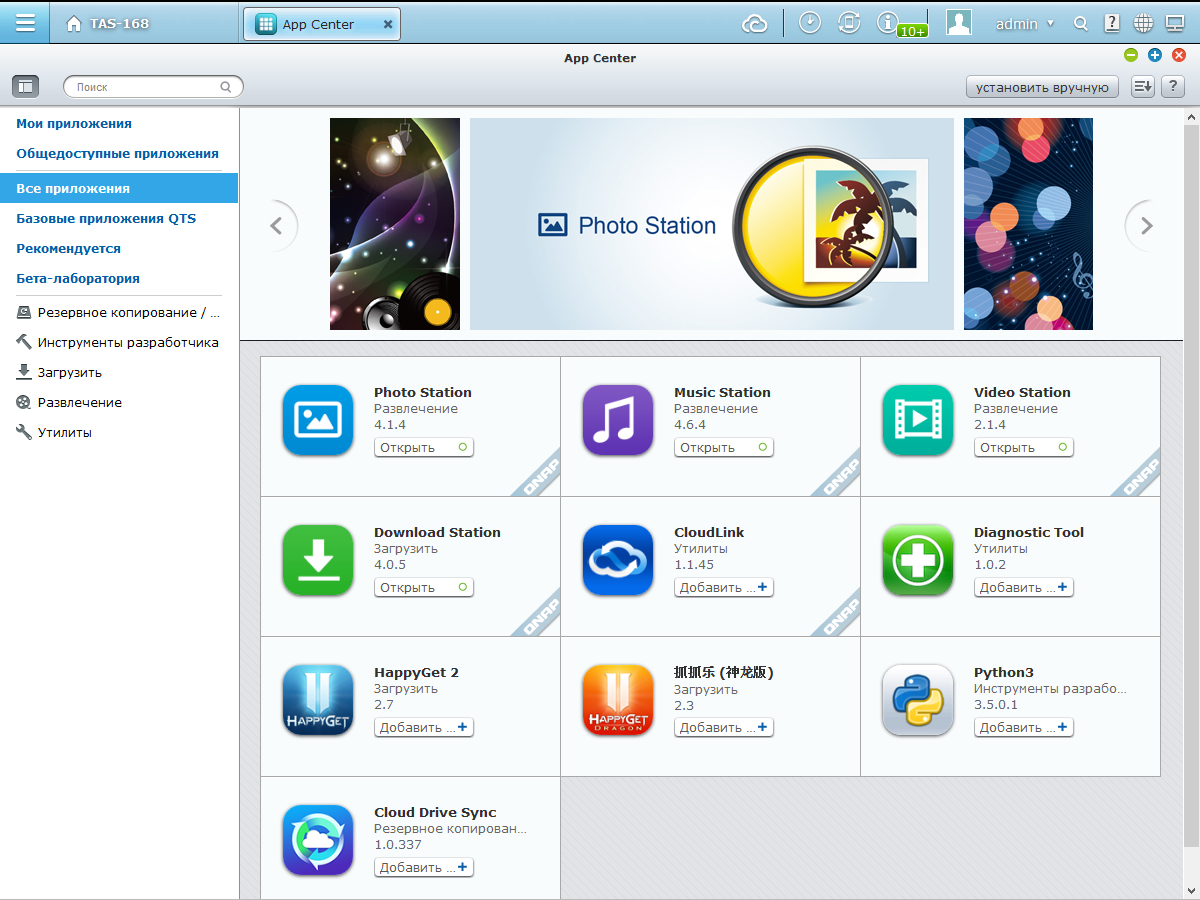 Формально можно считать, что благодаря поддержке Google Play существуют десятки тысяч дополнительных программ, однако надо учитывать и возможности устройства, а также отличия между серверными и интерактивными приложениями. Отметим, что с обновлением QTS до версии 4.2, запланированным на январь, производитель рассчитывает увеличить и число дополнительных пакетов в App Center.