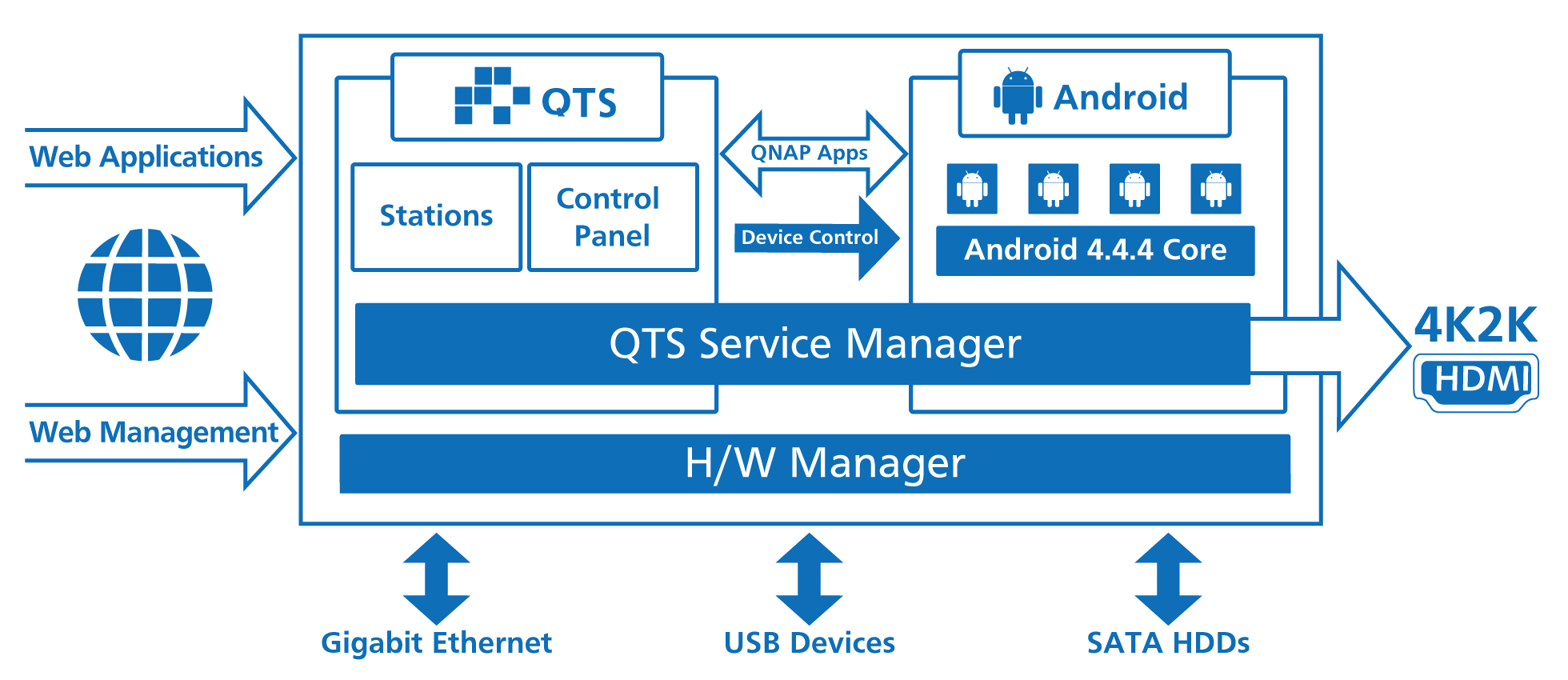 Производитель приводит в описании продукта иллюстрацию взаимодействия QTS, Android и аппаратного обеспечения, но, честно говоря, ничего полезного из нее понять нельзя.