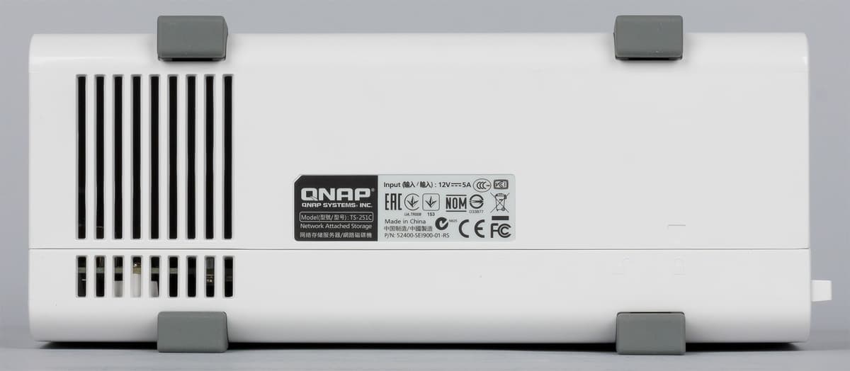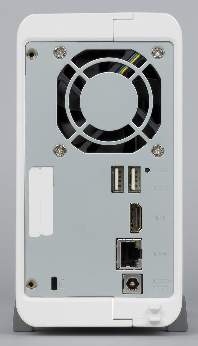 Задняя панель не закрыта пластиком и мы видим серый металл. В верхней части находится решетка вентилятора, который в этой модели из-за сокращения ширины корпуса также стал немного меньше по сравнению с TS-251 — его размеры составляют 60 мм. Под решеткой — все остальные разъемы: два порта USB 2.0, порт HDMI, гигабитный сетевой порт со встроенными индикаторами и вход для блока питания. Также есть скрытая кнопка сброса и отверстие кенсингтонского замка.