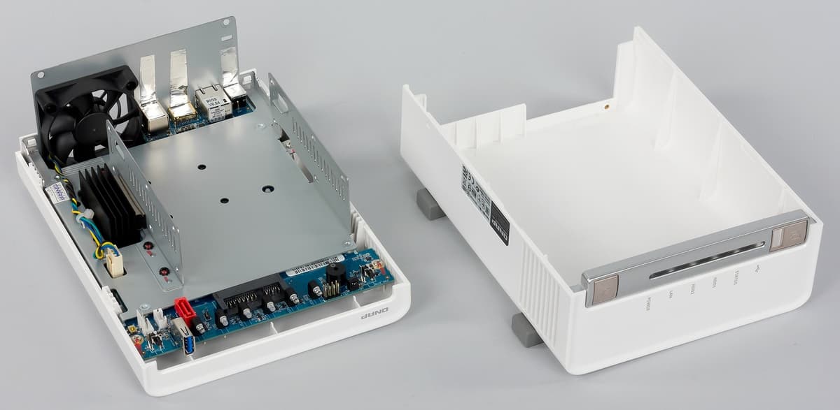 Внутри мы видим металлическую раму, под которой находится основная и единственная печатная плата накопителя. На ней установлен SoC (Intel Celeron J1800, 2C/2T, x86-64, 2,41 ГГц, TDP 10 Вт), накрытый достаточно крупным радиатором. Также мы видим здесь припаянные чипы оперативной памяти DDR3 общим объемом 1 ГБ, микросхему аппаратного мониторинга Fintek F71869AD, флэш на 8 МБ с основным загрузчиком и модуль Apacer с интерфейсом USB для образа операционной системы. Контроллеры SATA и USB (как 2.0, так и 3.0) встроены в SoC. В нем же есть и графический адаптер, обслуживающий порт HDMI. А вот сетевой чип внешний — Intel i210. Также на плате можно найти несколько разъемов неизвестного назначения и кнопку сброса настроек.