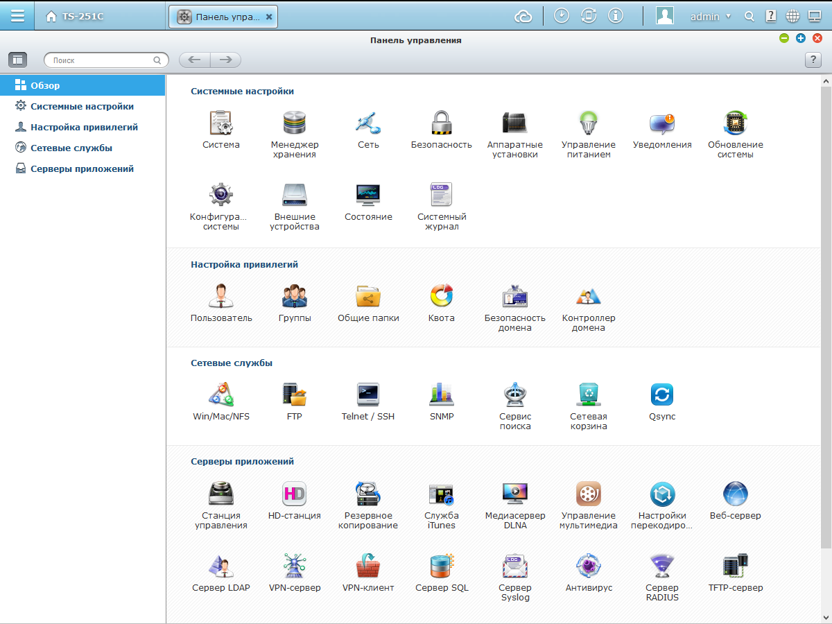 Основные настройки системы собраны в модуле «Панель управления». Его организация у QNAP, на наш взгляд, немного запутана, поскольку некоторые пункты меню (например, настройка дисковых массивов или мониторинг состояния) открывают новые окна.