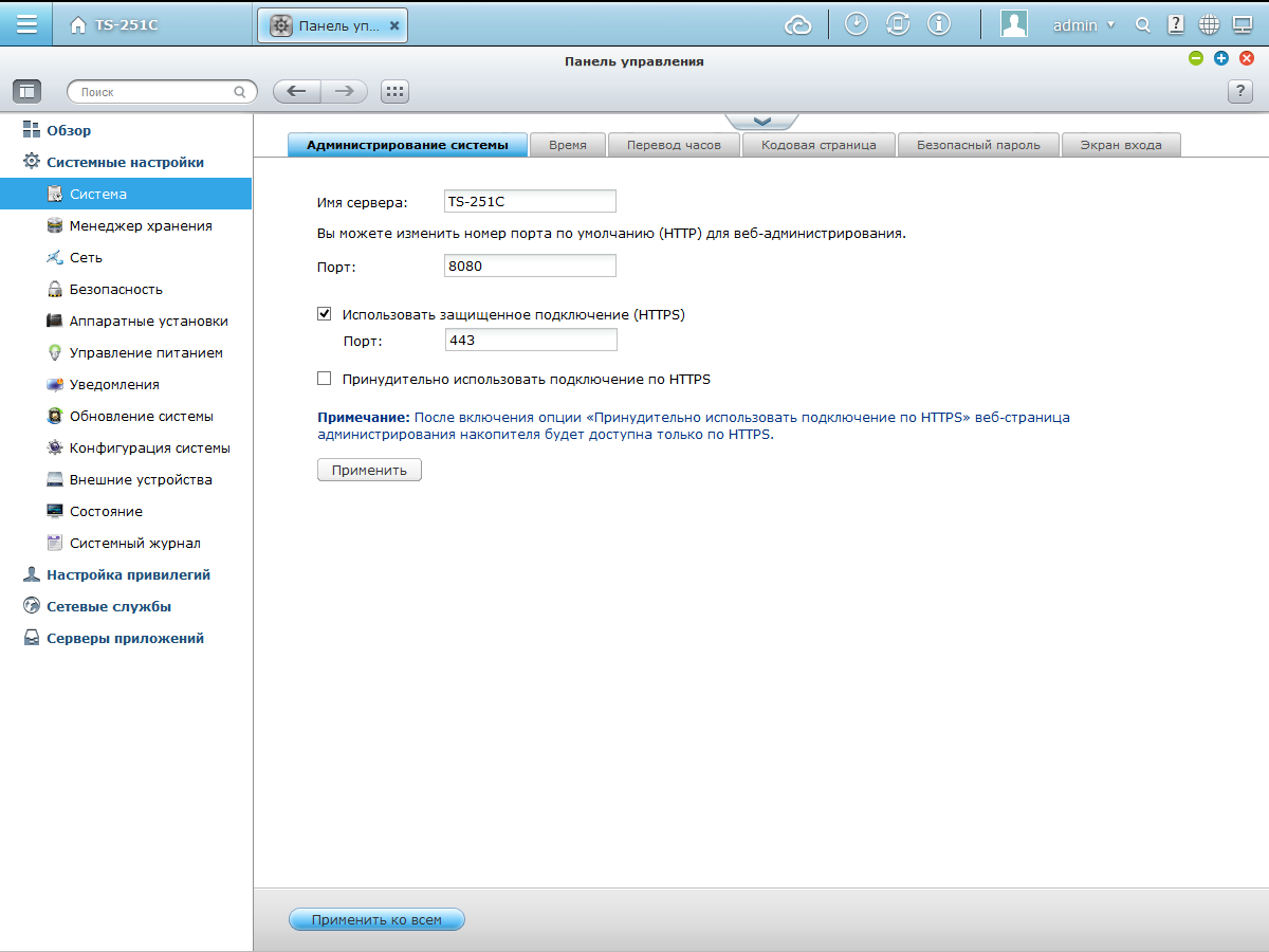 Базовые настройки устройства включают в себя выбор сетевого имени, портов веб-интерфейса, установку часов. Поддерживается сохранение и восстановление конфигурации накопителя, обновление прошивки из файла или через интернет.