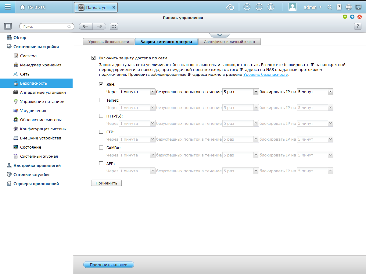 В настройках сетевого адаптера кроме привычного выбора IP-адреса, есть клиент DDNS и настройка прокси-сервера для доступа сетевого накопителя к интернету. Дополнительные уровни защиты обеспечиваются использованием HTTPS и сертификатов SSL, блокировкой при обнаружении попытки подбора пароля и встроенным межсетевым экраном.