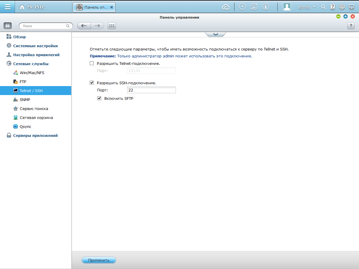 В сетевом накопителе реализованы протоколы Telnet и SSH для доступа к консоли операционной системы. Для интеграции в системы мониторинга будет полезна поддержка протокола SMNP.