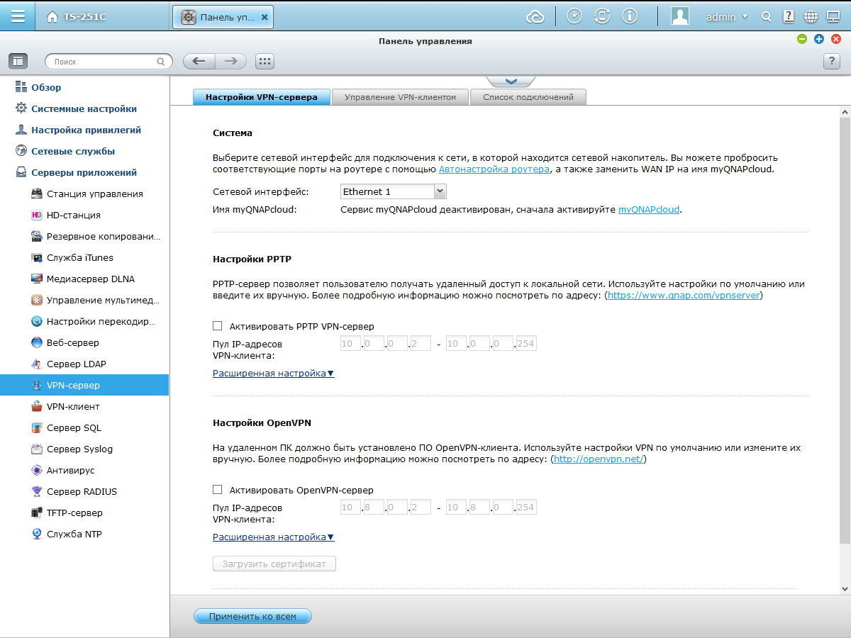 Больше всего пунктов в разделе меню «Серверы приложений». Благодаря поддержке многочисленных дополнительных приложений, устройство можно заслуженно считать не просто сетевым накопителем, а настоящим сервером. В частности оно способно выполнять задачи серверов LDAP, VPN, Web, RADIUS, SQL, Syslog, TFTP и других.