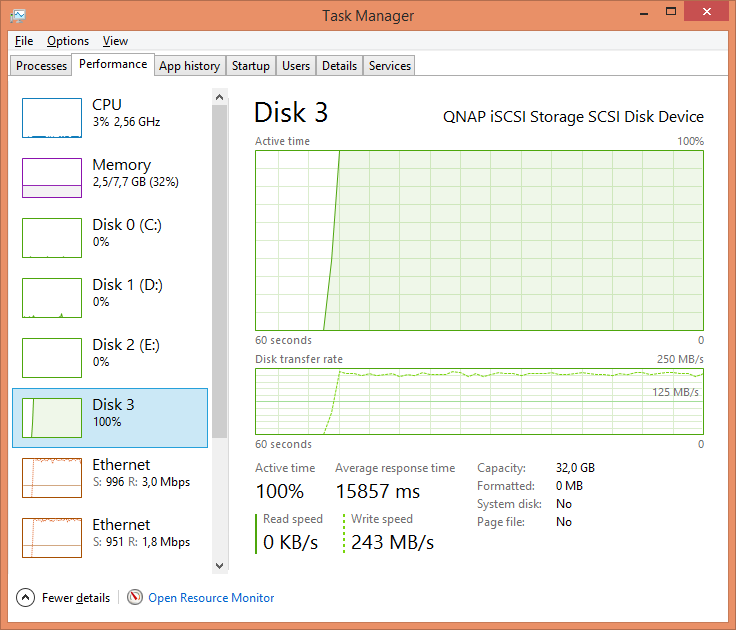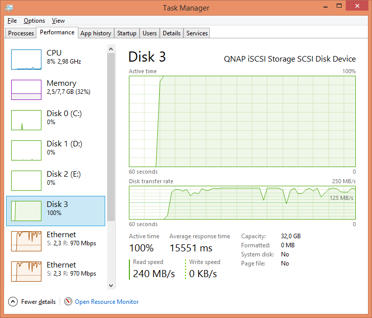 Для проверки такого сценария мы использовали утилиту IOmeter и подключение к тому iSCSI на массиве RAID5 с двух сетевых карт, установленных на стороне клиента, одновременно. В этом случае, от сетевого коммутатора не требуется ничего, кроме наличия нужного числа портов. Никакие режимы объединения в этот раз мы не использовали. Благодаря поддержке MCS (Multiple Connected Session) в штатном инициаторе iSCSI операционной системы Windows, мы смогли подтвердить указанные производителем цифры. На последовательных операциях общие скорости чтения и записи действительно составляли более 230 МБ/с. Конечно, это несколько искусственная ситуация, однако она показывает потенциальные возможности устройства.