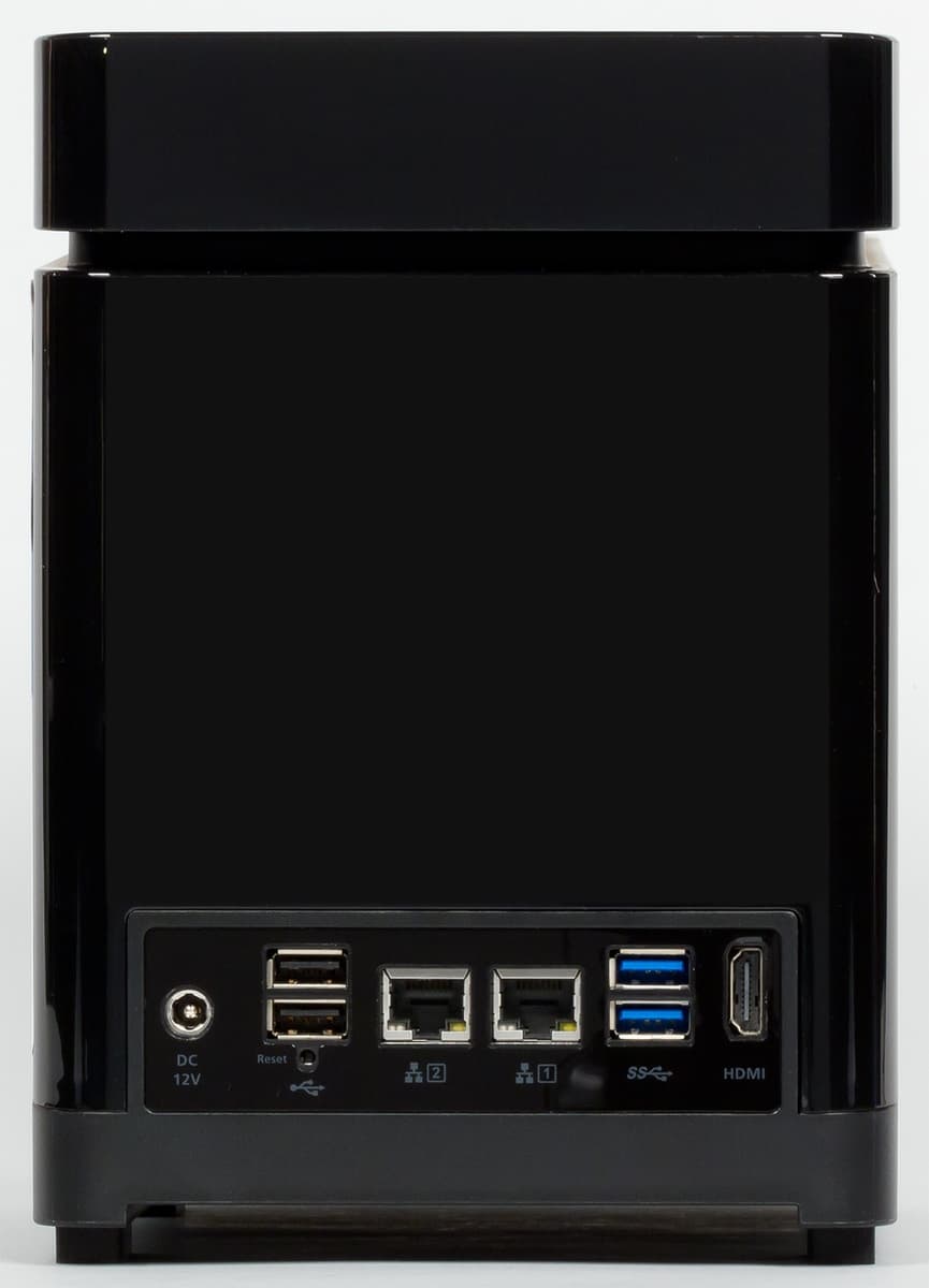 Остальные разъемы и порты собраны сзади. Здесь установлены вход блока питания, два порта USB 2.0, два гигабитных сетевых порта с индикаторами, два порта USB 3.0 и порт HDMI. Также есть и скрытая кнопка сброса настроек. Все это собрано на достаточно небольшом пространстве, но в большинстве случаев сложностей с подключением кабелей быть не должно.