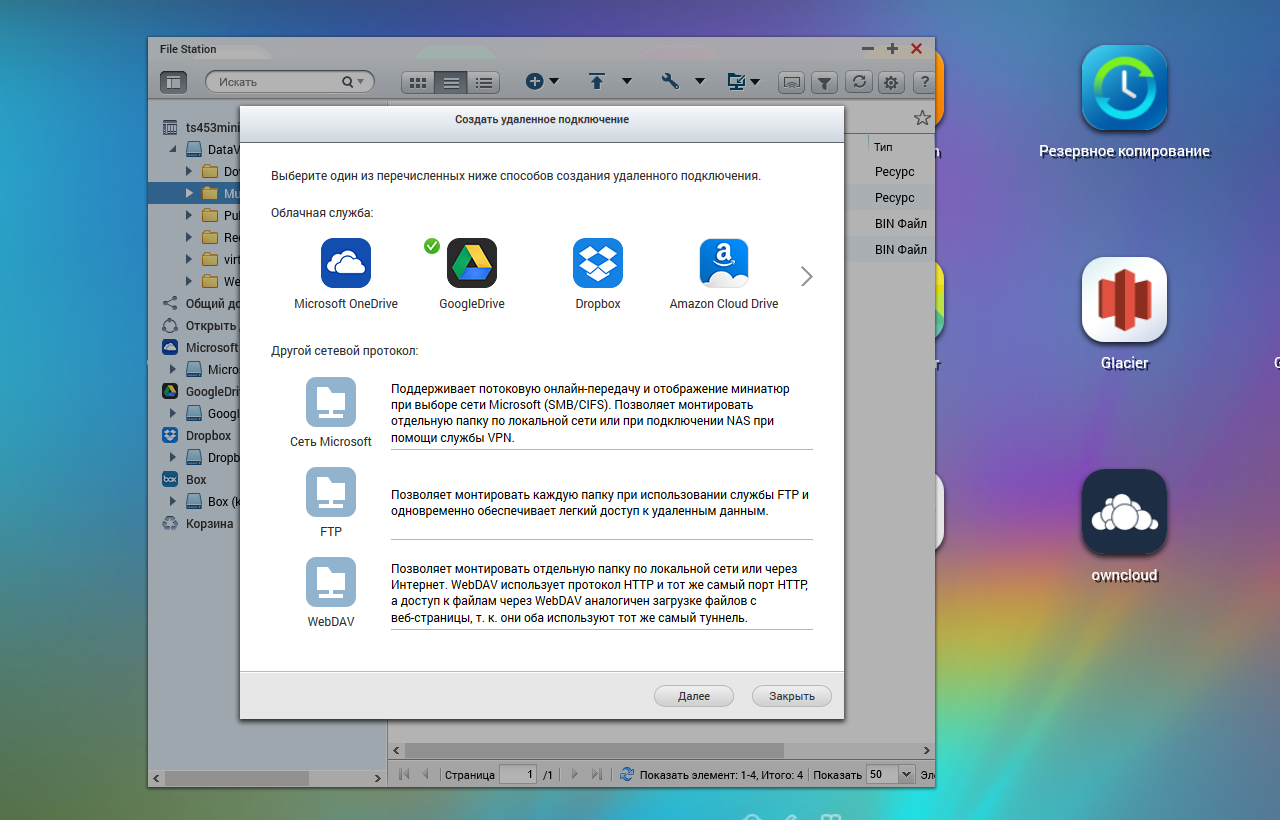 Второй вариант работы с внешними облаками — подключение их ресурсов как виртуальных папок в File Station, что позволит вам копировать файлы из и в облако в этом модуле. Для этого необходимо сначала установить приложение Connect to Cloud Drive. В нем поддерживаются следующие сервисы: Microsoft One Drive, GoogleDrive, Dropbox, Amazon Cloud Drive, Yandex Disk и Box. При подключении аккаунта происходит авторизация для доступа в облачной службе, после чего в дереве файлов у вас появляются данные из облака. Заметим, что операции проводятся в фоновом режиме, причем можно использовать облачные сервисы и для получателя, и для отправителя. Подключения к сервисам индивидуальны для каждого пользователя и сохраняются после повторного входа в веб-интерфейс, а также перезагрузки. К сожалению, в мобильной утилите облачные сервисы не видны.