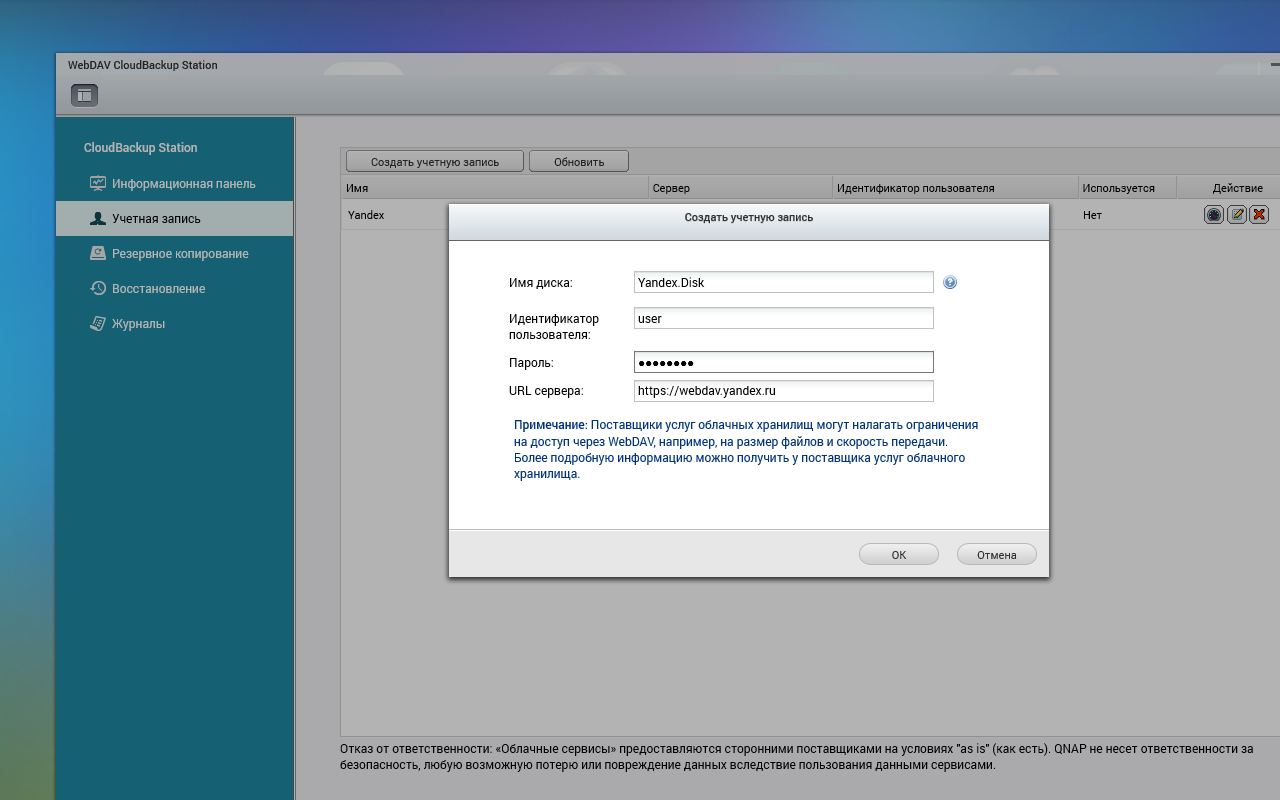 Несколько программ, объединенных названием CloudBackup Station, имеют сходный интерфейс и возможности. Основные отличия — на странице указания аккаунтов сервисов. Здесь поддерживаются, в частности, Azure Storage, Google Cloud Storage, Glacier, S3Plus и основанные на OpenStack Swift решения. Есть и возможность использовать других провайдеров, которые предоставляют доступ к данным по WebDAV. Указанные сервисы ориентированы на бизнес-пользователей и являются платными. Так что для теста мы воспользовались поддержкой WebDAV в Yandex.Disk.